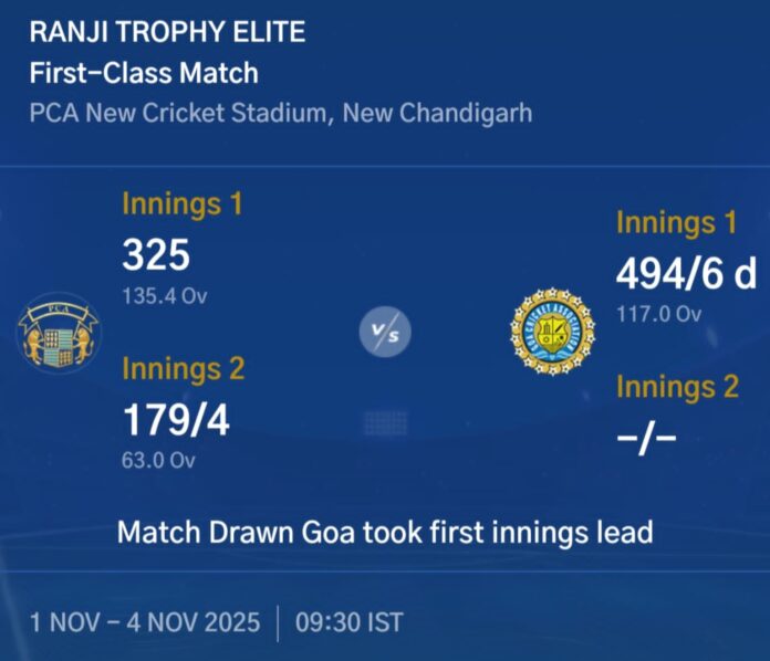 Goa bagged 3 points due to their first innings lead over Punjab as their Ranji Trophy Elite Group B match ended in a draw at New Chandigarh on Tuesday. Goa are in the top position on the points table with 11 points from 3 matches.